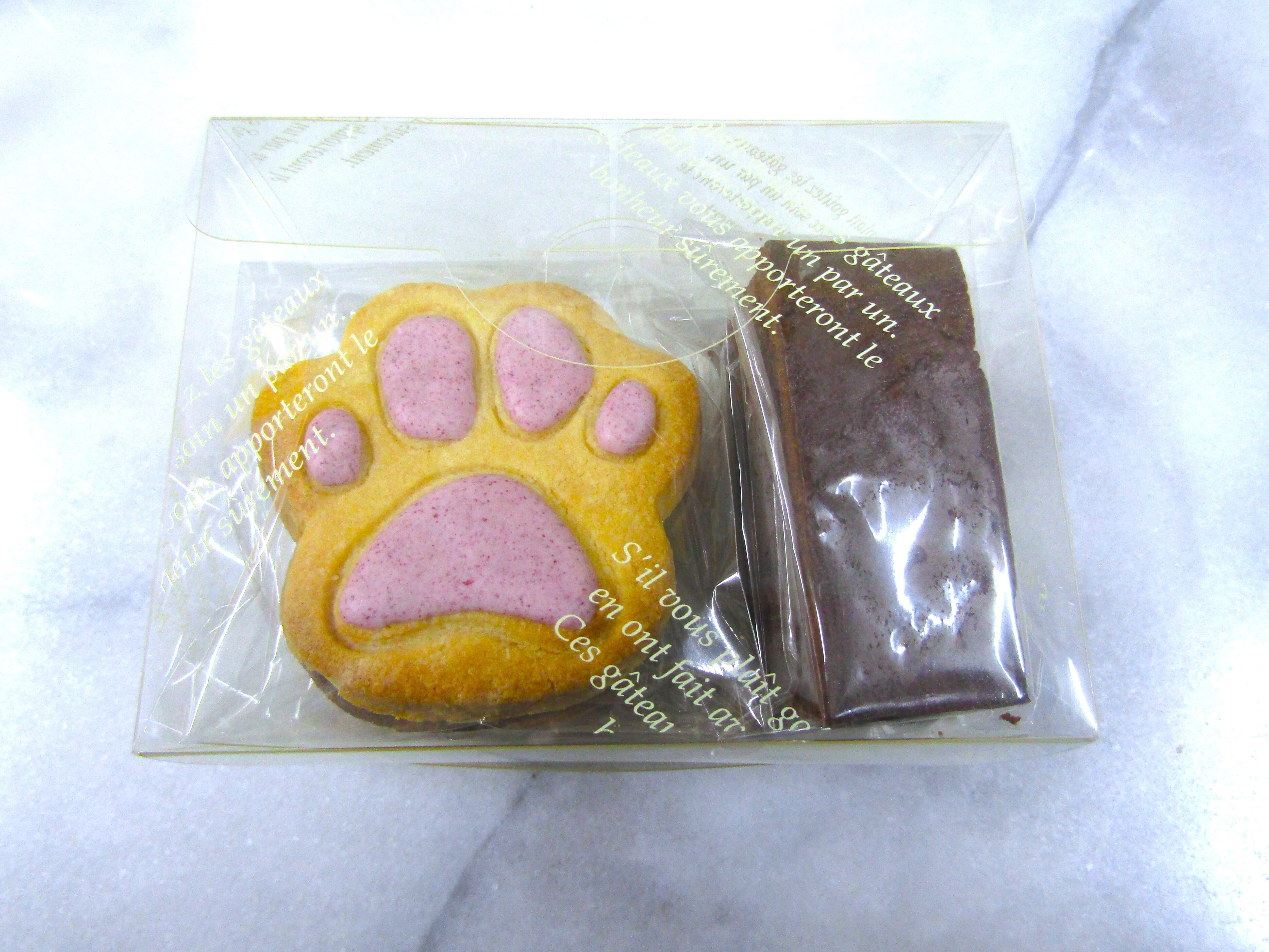 肉球をモチーフにしたかわいらしいクッキーと人気の小菓子のセットです。